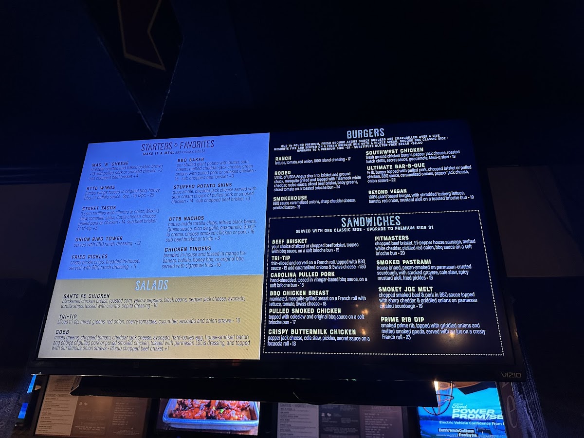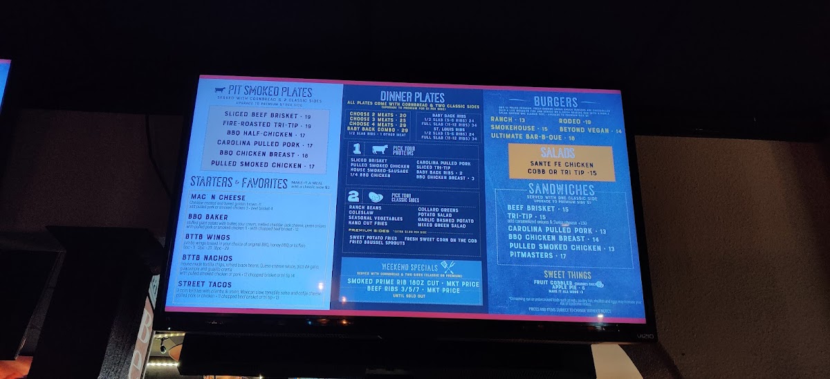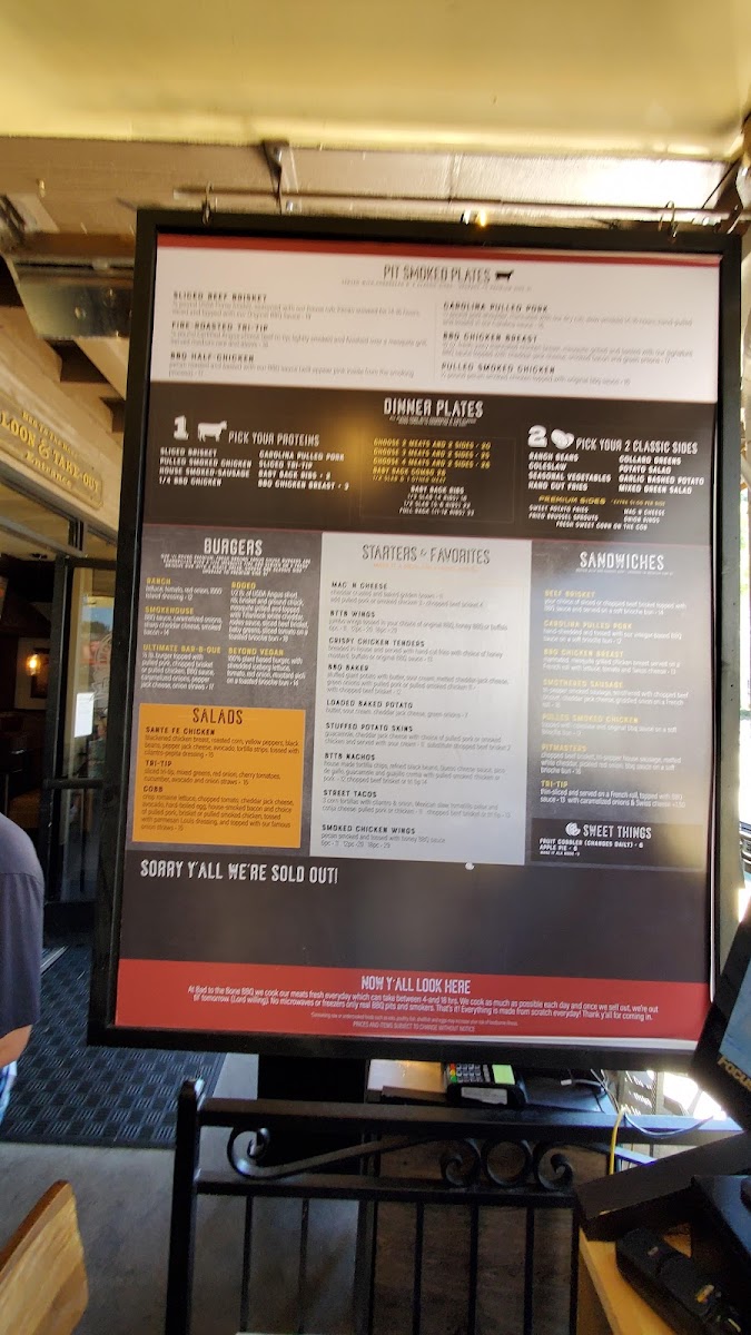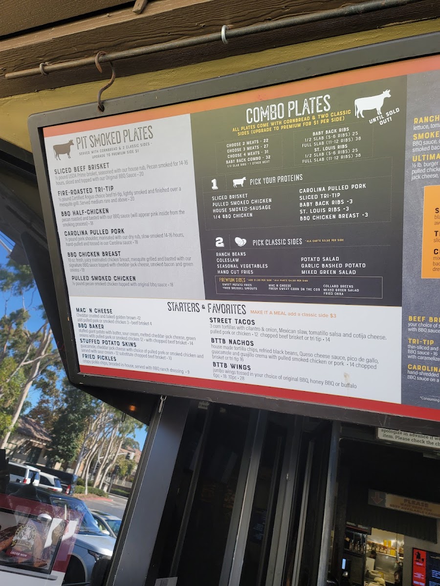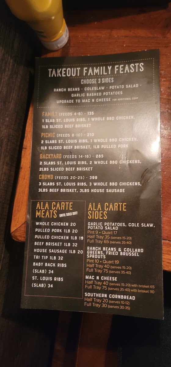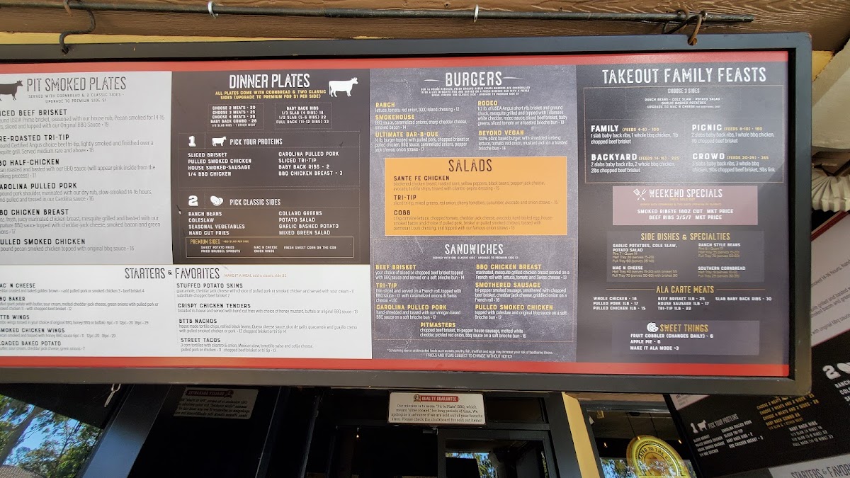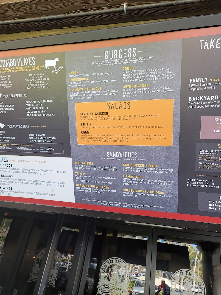 You’ll find a selection of plates centering on tender smoked meats like ribs, pulled pork, and tri-tip, often paired with traditional sides such as baked beans, corn on the cob, and creamy mac and cheese. Options like the Combination Rib Plate or Santa Fe Chicken Salad add variety, while sides like garlic mashed potatoes or collard greens bring a touch of home-style comfort to your meal.